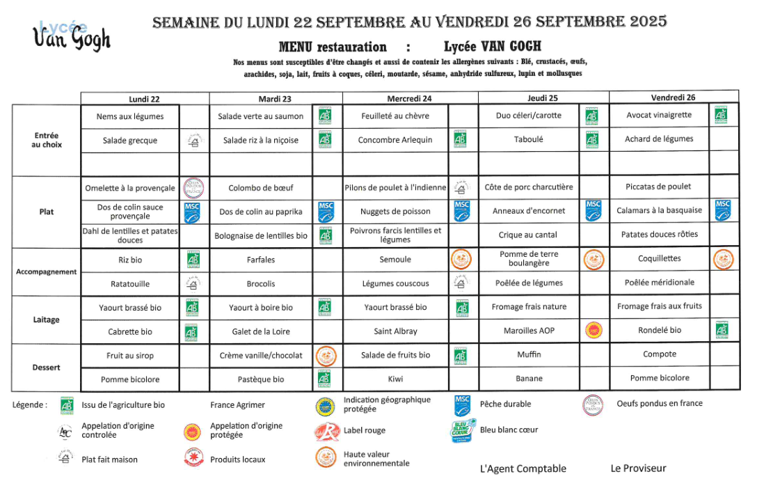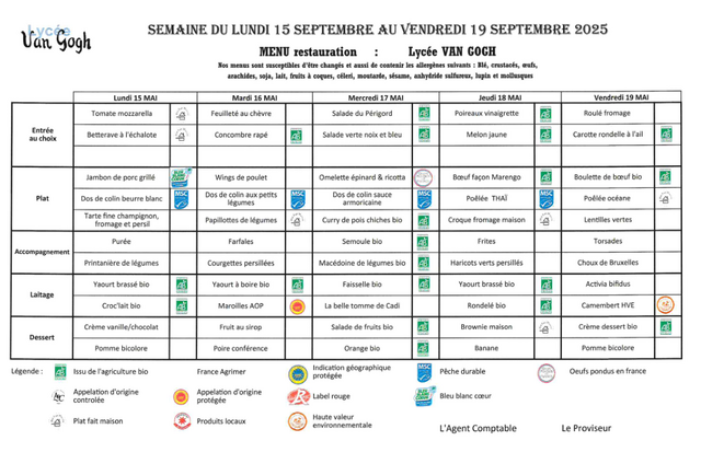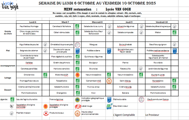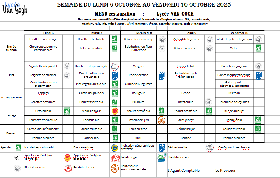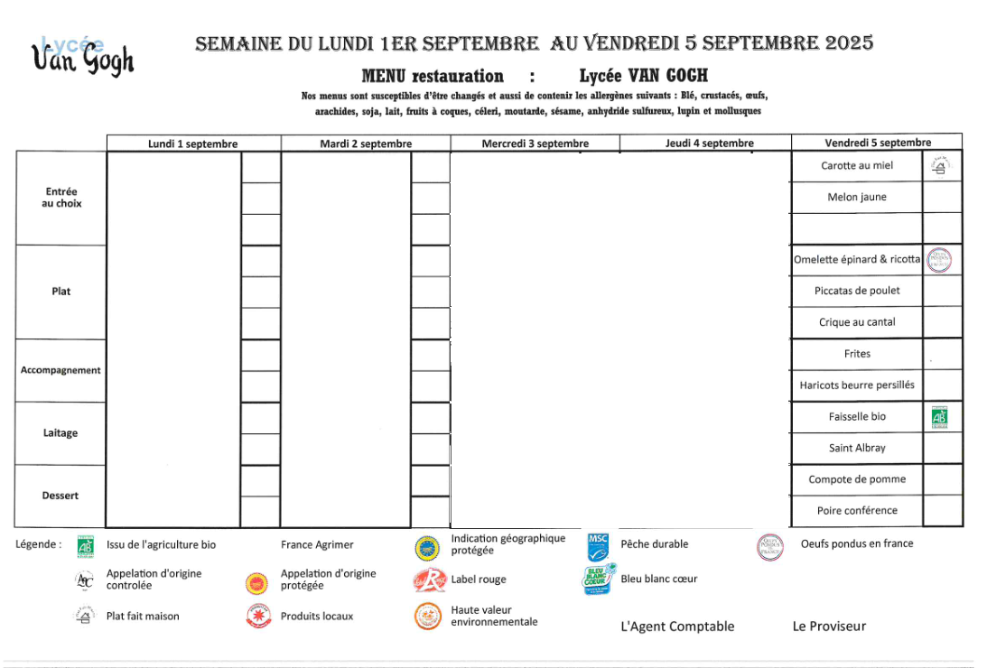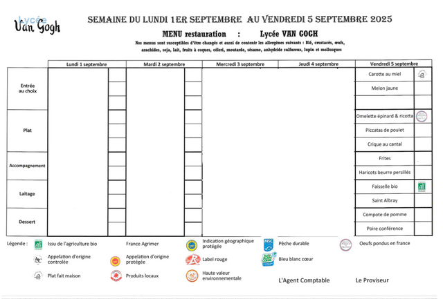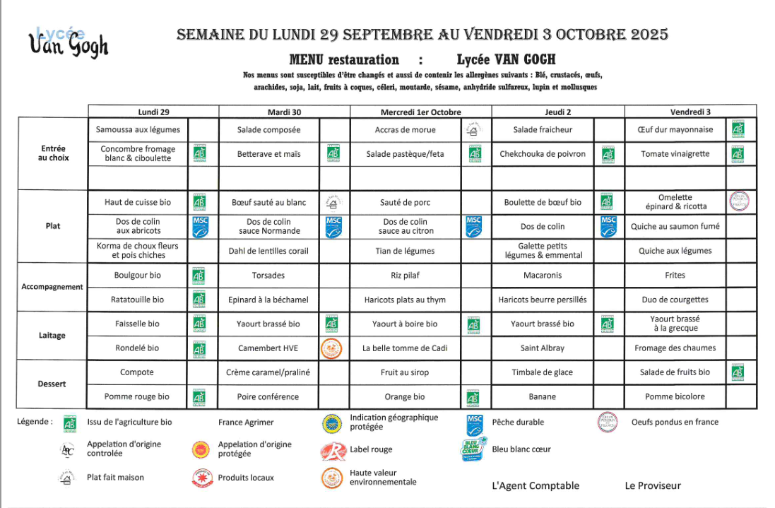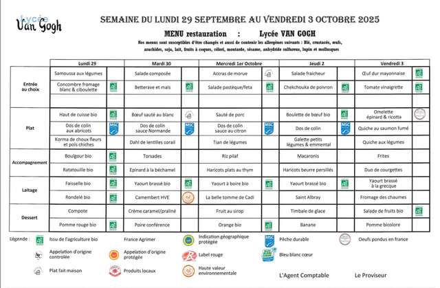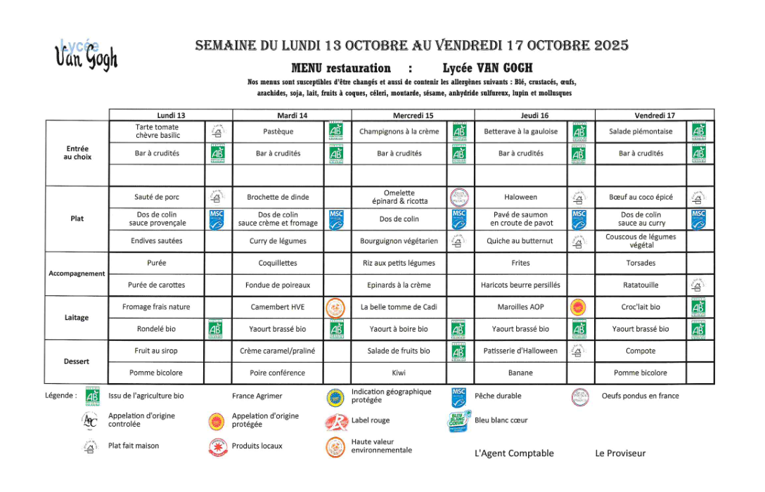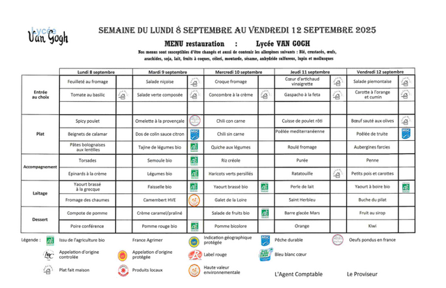 Accueil > Demi-pension > Menus du 5 sept. au 17 oct. 2025
