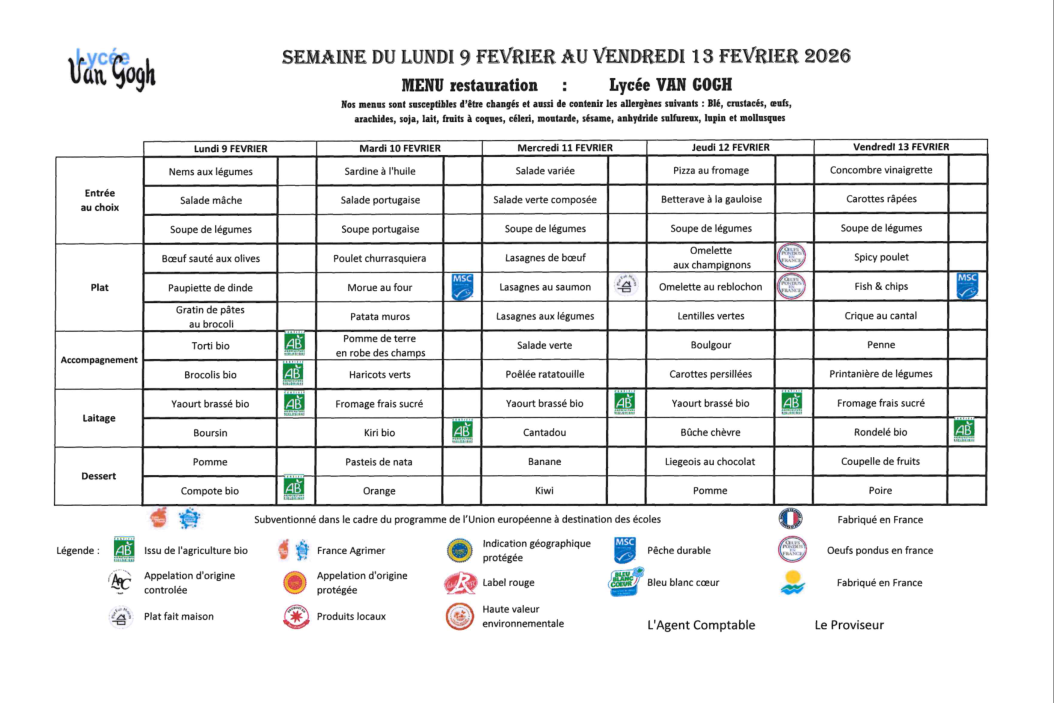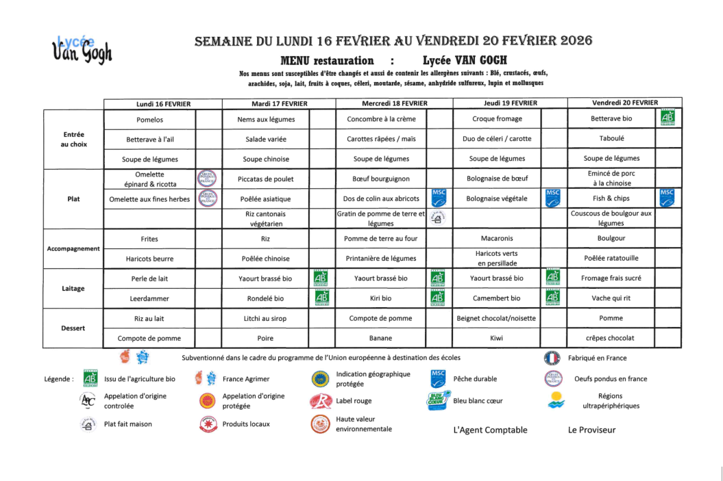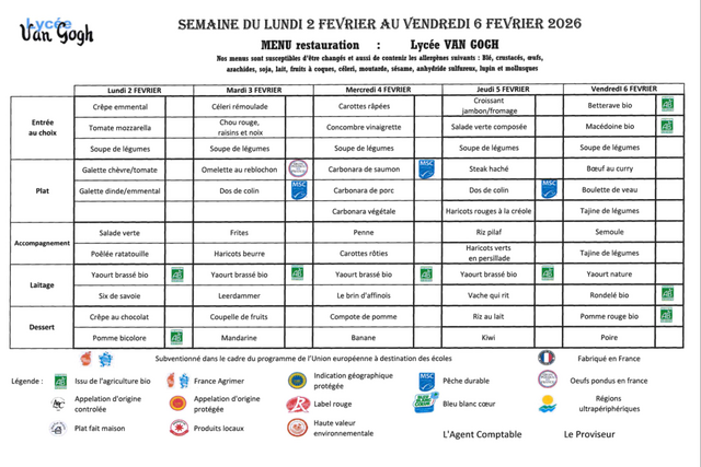 Accueil > Demi-pension > Menus de février 2026